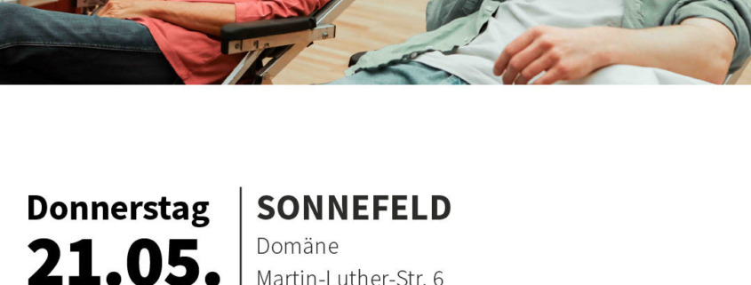 Am Donnerstag, 21. Mai 2026, macht der Blutspendedienst des Bayerischen Roten Kreuzes wieder Station in der Domäne Sonnefeld, Martin-Luther-Str. 6, 96242 Sonnefeld.
